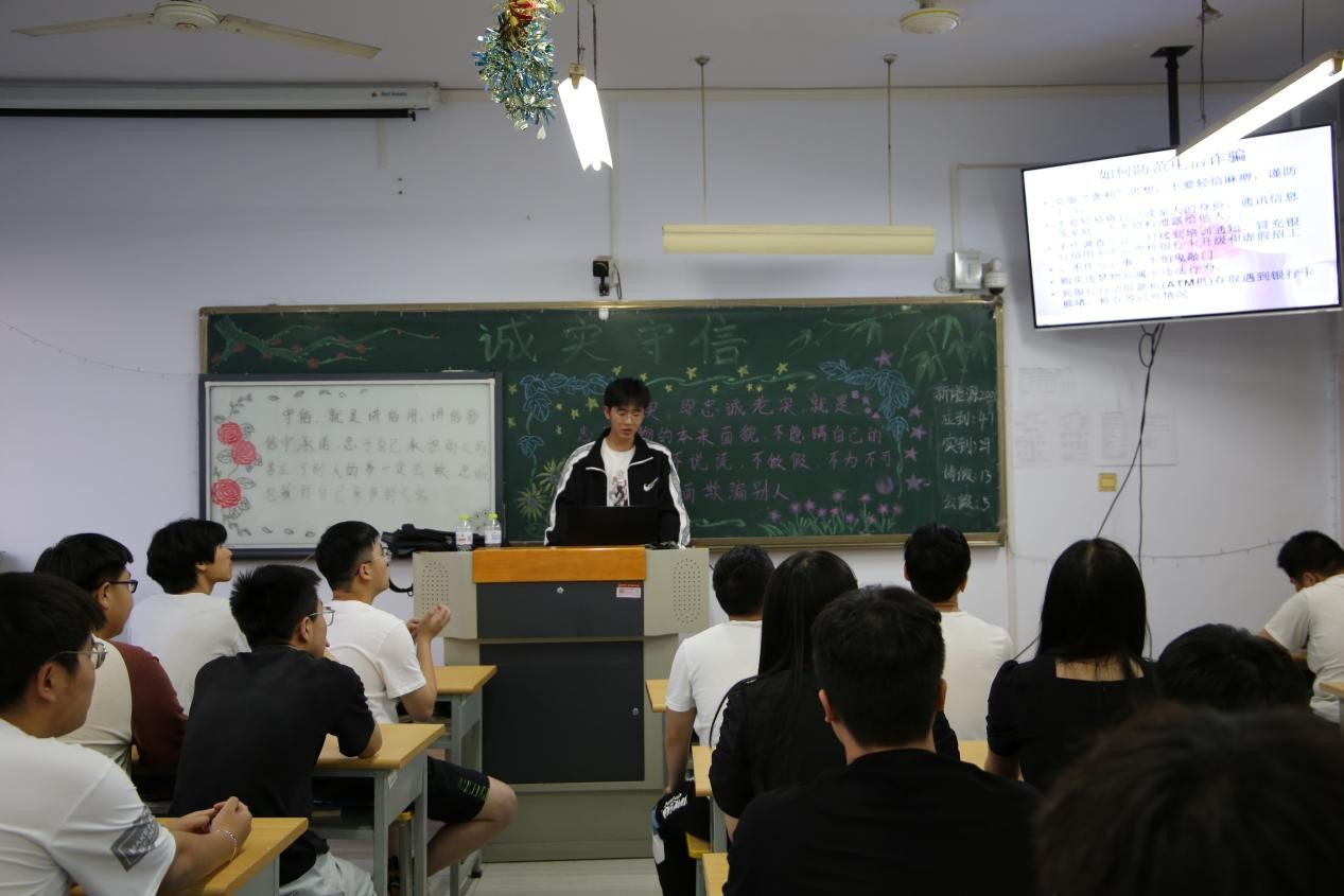 此次主题班会由各班生活委员主持召开,首先,各班生活委员通过PPT的形式,带领同学们了解了当今老员工普遍存在一种诚信危机,形如考试作弊、不按时缴纳学费、甚至恶意拖欠;通过假证明获取助学贷款、编造虚假荣誉获取就业机会等等,使同学们真切地体会到诚信的重要性。之后,通过举例古往今来诚实守信的榜样,为同学们树立起诚实守信的标杆,营造了良好的氛围,并提醒同学们在以后的学习和生活中,以诚信为准绳,时时自省,时时自律,此次课程,使同学们受益匪浅,让大家一起建立诚实守信的意识
