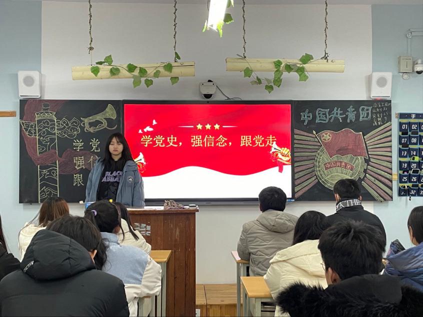 此次活动由各班团支书带领大家学习。首先,各班团支书带领大家系统地学习了党的光辉历史,从嘉兴南湖的红船到南昌的第一声枪响,从瑞金的星星之火到井冈山的铮铮青松,使同学们深刻感悟中国共产党的初心和使命。然后,团支书带领大家一同观看国史讲堂党史系列短视频,深入了解了红船精神、长征精神的丰富内涵。最后,各班团支书邀请同学们上台讲述党史学习的感悟,同学们纷纷表示“明镜所以照形,古事所以知今。”历史事过去的现实,现实事未来的历史,学习党史是为了更好地走向未来。只有对党的历史有深刻了解,我们才能更好地做好今天的工作,承担起明天的责任。