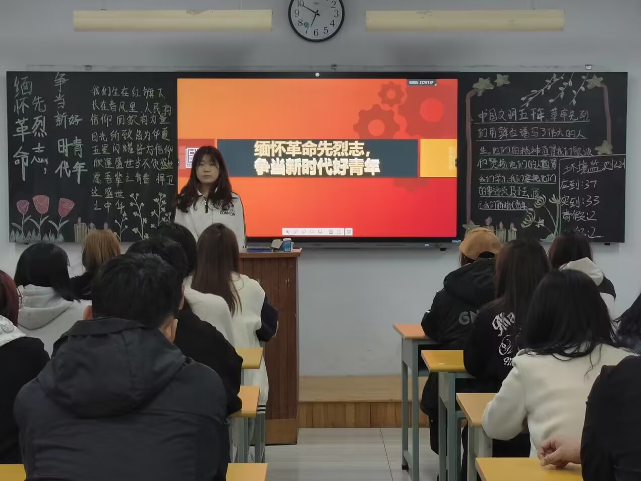 此次团课由各班团支书主持召开。团课上,团支书为同学们讲述革命先烈为了民族解放和人民幸福而战斗、牺牲的感人故事:黄继光用身体堵枪眼,掩护队友前进;董存瑞手举炸药包,炸毁碉堡;邱少云身燃大火,但仍保持潜伏状态,壮烈牺牲。各班同学积极发言,表示会学习革命先辈为保家卫国不顾一切的精神,铭记历史,缅怀英雄,不忘初心,砥砺前行。