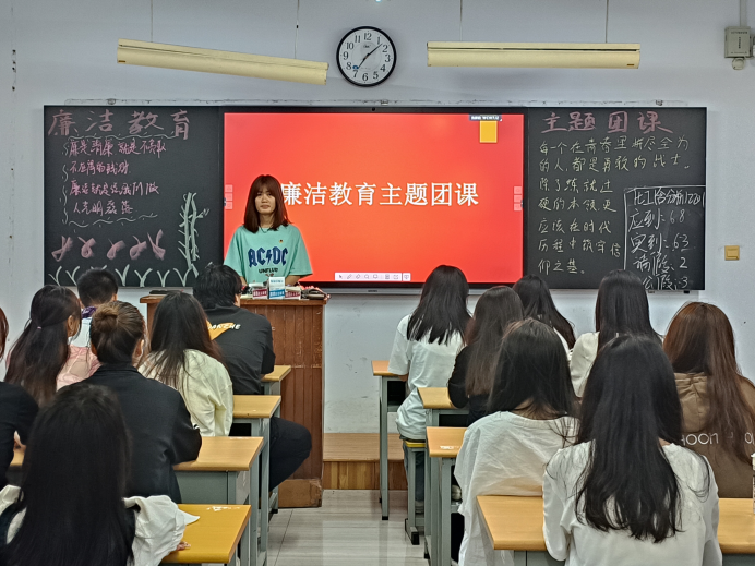 团支书与同学们积极互动,相互探讨关于廉洁的成语、诗词、歇后语及象征廉洁的植物。抛出“为什么讲廉洁教育?”这一问题,引发同学们的思考。例举严以律己、廉洁奉公的名人故事:“任何时候都不搞特殊化”的焦裕禄,带领兰考群众战天斗地;“不带私心搞革命,一心一意为人民”的谷文昌,在荒山石滩造林,留下满山木麻黄;群众心中的“最美扶贫书记”黄诗燕,用生命兑现了“脱贫功成,必定有我”的誓言。引导同学们明大德、守公德、严私德,以忠诚、干净、有担当的实际行动踔厉奋发、勇毅前行。