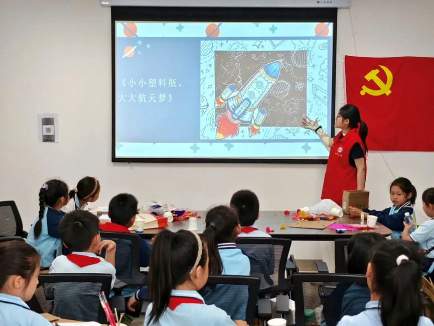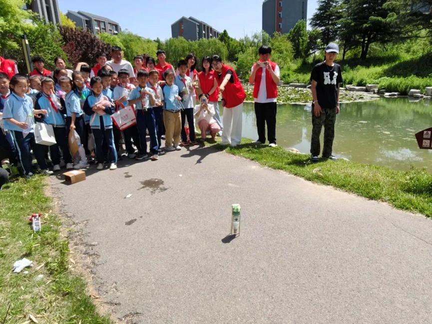 在“小小塑料瓶,大大航天梦”环节,志愿者与孩子们携手合作,利用塑料瓶制作简易火箭模型。从裁剪瓶身到装饰美化,每一步都充满创意与巧思。制作过程中,志愿者穿插讲解了火箭的构造与飞行原理,将航天知识融入实践。随后,大家移步室外,通过醋与小苏打发生化学反应产生的气体,成功推动“火箭”发射。随着火箭腾空而起,孩子们欢呼雀跃,不仅锻炼了动手能力,更直观地感受到火箭发射的科学原理,点燃了他们对航天世界的好奇与向往。